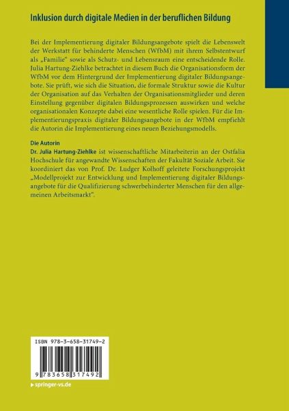 Bei der Implementierung digitaler Bildungsangebote spielt die Lebenswelt der Werkstatt für behinderte Menschen (WfbM) mit ihrem Selbstentwurf als "Familie" sowie als Schutz- und Lebensraum eine entscheidende Rolle. Julia Hartung-Ziehlke betrachtet in diesem Buch die Organisationsform der WfbM vor dem Hintergrund der Implementierung digitaler Bildungsangebote. Sie prüft, wie sich die Situation, die formale Struktur sowie die Kultur der Organisation auf das Verhalten der Organisationsmitglieder und deren Einstellung gegenüber digitalen Bildungsprozessen auswirken und welche organisationalen Konzepte dabei eine wesentliche Rolle spielen. Für die Implementierungspraxis digitaler Bildungsangebote in der WfbM empfiehlt die Autorin die Implementierung eines neuen Beziehungsmodells.