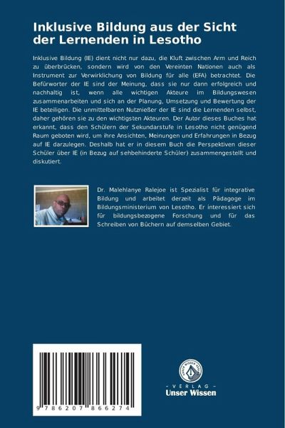 Inklusive Bildung (IE) dient nicht nur dazu, die Kluft zwischen Arm und Reich zu überbrücken, sondern wird von den Vereinten Nationen auch als Instrument zur Verwirklichung von Bildung für alle (EFA) betrachtet. Die Befürworter der IE sind der Meinung, dass sie nur dann erfolgreich und nachhaltig ist, wenn alle wichtigen Akteure im Bildungswesen zusammenarbeiten und sich an der Planung, Umsetzung und Bewertung der IE beteiligen. Die unmittelbaren Nutznießer der IE sind die Lernenden selbst, daher gehören sie zu den wichtigsten Akteuren. Der Autor dieses Buches hat erkannt, dass den Schülern der Sekundarstufe in Lesotho nicht genügend Raum geboten wird, um ihre Ansichten, Meinungen und Erfahrungen in Bezug auf IE darzulegen. Deshalb hat er in diesem Buch die Perspektiven dieser Schüler über IE (in Bezug auf sehbehinderte Schüler) zusammengestellt und diskutiert.