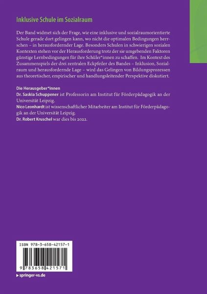 Der Band widmet sich der Frage, wie eine inklusive und sozialraumorientierte Schule gerade dort gelingen kann, wo nicht die optimalen Bedingungen herrschen - in herausfordernder Lage. Besonders Schulen in schwierigen sozialen Kontexten stehen vor der Herausforderung trotz der sie umgebenden Faktoren günstige Lernbedingungen für ihre Schüler_innen zu schaffen. Im Kontext des Zusammenspiels der drei zentralen Eckpfeiler des Bandes - Inklusion, Sozialraum und herausfordernde Lage - wird das Gelingen von Bildungsprozessen aus theoretischer, empirischer und handlungsleitender Perspektive diskutiert.