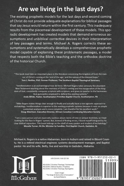 Are we living in the last days? Church history is divided on this important Christian doctrine. The existing prophetic models for the last days and second coming of Christ do not provide adequate explanations for biblical passages stating Jesus would return within the first century. This inadequacy results from the piecemeal development of these models. This sporadic development has created models that demand erroneous assumptions and unbiblical corrective devices in their interpretation of key passages and terms. Michael A. Rogers consults volumes of Scripture, literature, historical sources, and lines of reasoning to develop a new, better model of biblical prophecy. The end result is a prophetic model capable of explaining these problematic passages while respecting both the Bible's teaching and the orthodox doctrine of the historical Church. FINALIST: 2021 Southern Christian Writers' Conference (SCWC) Notable Book Award- Nonfiction