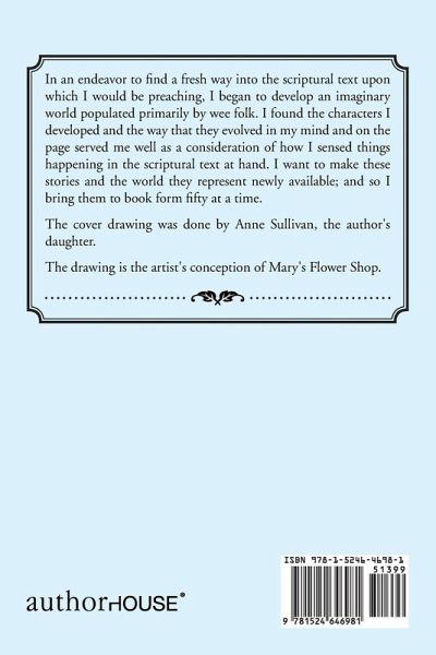 In an endeavor to find a fresh way into the scriptural text upon which I would be preaching, I began to develop an imaginary world populated primarily by wee folk. I found the characters I developed and the way that they evolved in my mind and on the page served me well as a consideration of how I sensed things happening in the scriptural text at hand. I want to make these stories and the world they represent newly available; and so I bring them to book form fifty at a time. The cover drawing was done by Anne Sullivan, the author's daughter. The drawing is the artist's conception of Mary's Flower Shop.