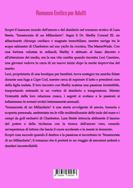 Scopri il lussuoso mondo dell'amore e del desiderio nel romanzo erotico di Lara Steele, "Innamorata di un Miliardario". Segui il Dr. Shelby Conrad III, un affascinante chirurgo cardiaco e magnate immobiliare, mentre naviga tra le acque salmastre di Charleston sul suo yacht da crociera, The MasonWade. Con una fortuna valutata in miliardi, Shelby è abituato al lusso discreto e all'attenzione dei media, ma la sua vita cambia quando incontra Lexi Casmino, una giovane vedova in cerca di un nuovo inizio dopo la morte improvvisa del marito.Lexi, proprietaria di una boutique per bambini, trova sostegno tra amiche fidate durante una fuga a Cape Cod, mentre cerca di superare il lutto e prendersi cura della figlia malata. Il loro incontro con Shelby scatena una passione irresistibile, trasportando entrambi in un vortice di desiderio e trasgressione. Mentre l'intensità della loro relazione cresce, i segreti si svelano e le passioni si infiammano in scenari erotici intensamente sensuali."Innamorata di un Miliardario" è una storia avvolgente di amore, lussuria e scoperta personale, ambientata tra le ville multimilionarie delle isole del mare e i campi da golf esclusivi di Charleston. Lara Steele intreccia abilmente il fascino del potere e della ricchezza con la ricerca dell'amore vero, creando un'esperienza di lettura che lascia il cuore accelerato e la mente in fermento.Scopri cosa succede quando il destino e la passione si incontrano in "Innamorata di un Miliardario", il romanzo che ti porterà in un viaggio di emozioni ardenti e desideri incontrollabili.