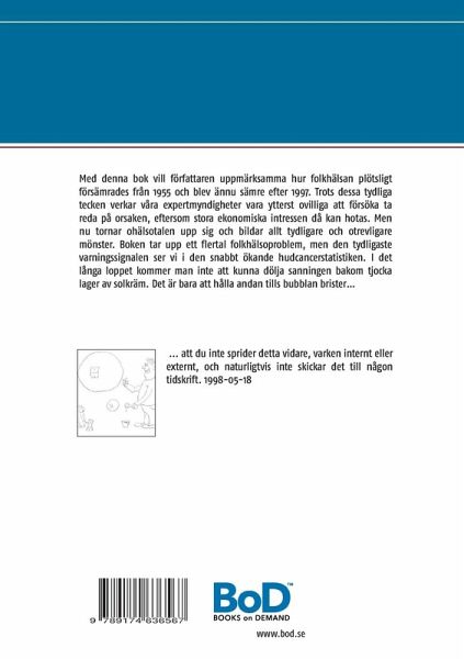 Med denna bok vill författaren uppmärksamma hur folkhälsan plötsligt försämrades från 1955 och blev ännu sämre efter 1997. Trots dessa tydliga tecken verkar våra expertmyndigheter vara ytterst ovilliga att försöka ta reda på orsaken, eftersom stora ekonomiska intressen då kan hotas. Men nu tornar ohälsotalen upp sig och bildar allt tydligare och otrevligare mönster. Boken tar upp ett flertal folkhälsoproblem, men den tydligaste varningssignalen ser vi i den snabbt ökande hudcancerstatistiken. I det långa loppet kommer man inte att kunna dölja sanningen bakom tjocka lager av solkräm. Det är bara att hålla andan tills bubblan brister...