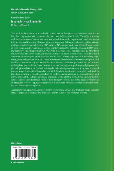 This book explores methods to study the complex and evolving interplay between a virus and its host that range from model systems to the detection of chemical molecules. The collection starts with the application of humanized mice and zebrafish as model organisms to study virus-host interactions and induction of innate immune responses. Subsequent chapters outline diverse methods to detect small interfering RNAs, microRNAs, and virus-derived dsRNA from a variety of cells, tissues, and organisms, as well as to interrogating the cytosolic RNA and DNA sensing pathways, including using RNA PAMPs as molecular tools, purification of cGAMP from virus particles and infected cells, and mechanisms to visualize the subcellular localization and activation of the adaptor proteins MAVS and STING. Cutting-edge methods, including high-throughput and genome-wide CRISPR/Cas9 screens, chromosome conformation capture, and whole-exome sequencing, are described to identify novel mediators, pathways, and variants underlying host susceptibility. Given the importance of studying these pathways and players under physiologic conditions, methods describing the isolation of primary mouse sensory neurons and group 2 innate lymphoid cells are also provided. Finally, this collection comes full circle back to the whole organism level and concludes with epidemiological methods to investigate virus-host interactions and the induction of innate immunity. Written for the Methods in Molecular Biology series, chapters include introductions to their respective topics, lists of the necessary materials and reagents, step-by-step, readily reproducible laboratory protocols, and tips on troubleshooting and avoiding known pitfalls.