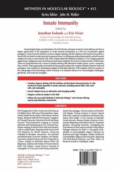 Immunologists today are interested in all of the diverse cell-types involved in host defense and have a deeper appreciation of the importance of innate immune mechanisms as a first line of protection against pathogens. This volume thus discusses the isolation and functional characterization of cells involved in innate immunity in mouse and man, including mast cells and eosinophils. Other focuses include natural killer cells, methods in statistics, in vivo imaging, genome engineering, and mutagenesis and culture that are adapted to the study of innate immunity in these hosts. These are complemented with a series of chapters dealing with alternative models: plants, worms, mosquitoes, flies, and fish. Together, these approaches and models are being used to dissect the complex interplay between hosts and pathogens and contribute to developing strategies to help fight infection. With chapters written by experts on the cutting-edge of this technology, Innate Immunity is an essential reference for immunologists, histologists, geneticists, and molecular biologists.