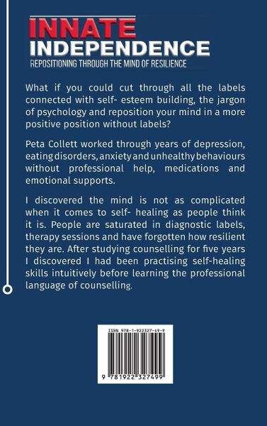 INNATE INDEPENDENCE Repositioning through the mind of resilience What if you could cut through all the labels connected with self- esteem building, the jargon of psychology and reposition your mind in a more positive way without labels? Peta Collett worked through years of depression, eating disorders, anxiety and unhealthy behaviours without professional help, medications and emotional supports. I discovered the healing of the mind is not as complicated as people think it is. People are saturated in diagnostic labels, therapy sessions and have forgotten how resilient we are as human beings. After studying Counselling for 5 years I discovered I had been practising skills intuitively in reorganising my thoughts before learning the professional language of counselling.