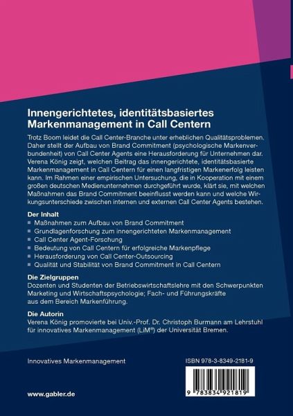 Trotz Boom leidet die Call Center-Branche unter erheblichen Qualitätsproblemen. Daher stellt der Aufbau von Brand Commitment (psychologische Markenverbundenheit) von Call Center Agents eine Herausforderung für Unternehmen dar. Verena König zeigt, welchen Beitrag das innengerichtete, identitätsbasierte Markenmanagement in Call Centern für einen langfristigen Markenerfolg leisten kann. Im Rahmen einer empirischen Untersuchung, die in Kooperation mit einem großen deutschen Medienunternehmen durchgeführt wurde, klärt sie, mit welchen Maßnahmen das Brand Commitment beeinflusst werden kann und welche Wirkungsunterschiede zwischen internen und externen Call Center Agents bestehen.