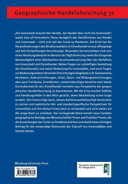 "Die Innenstadt braucht den Handel, der Handel aber nicht die Innenstadt", lautet eine oft formulierte These bezüglich des Verhältnisses von Handel und Innenstadt - nicht erst seit der Covid-19-Pandemie. Die Krise hat die Herausforderungen des Strukturwandels im Einzelhandel erneut offengelegt und teils Entwicklungen beschleunigt. Besonders hervorzuheben sind zum einen Handlungsbedarfe im Bereich der Digitalisierung sowie die dringende Notwendigkeit einer überdachten Auseinandersetzung über das Verhältnis von Innenstadt und Einzelhandel. Neben Fragen zur zukünftigen Gestaltung des Einzelhandels und seiner Bedeutung für Innenstädte, sind auch Fragen zur Bedeutung anderer Branchen/Einrichtungen/Angebote (z.B. Gastronomie, Handwerk, Kultureinrichtungen, Kitas, Sport- und Bildungseinrichtungen, aber auch Freiräume, Grünflächen, verkehrsberuhigte Bereiche oder lokale Kurierdienste) für den Einzelhandel vermehrt aus Perspektive der geographischen Handelsforschung zu beantworten. Mit der Krise wurden Defizite und Handlungsfelder in den Blick gerückt, deren Bearbeitung schon lange ansteht. Die Chance liegt darin, diesen Aufmerksamkeitsschub konstruktiv zu nutzen und realistische fall- und standortspezifische Perspektiven für Innenstädte und ihre Akteur*innen jetzt zu verhandeln und nicht weiter auf die lange Bank zu schieben. Der vorliegende Band vereint neun handelsgeographische Beiträge von Wissenschaftler*innen und Praktiker*innen, die die Auswirkungen der Covid-19-Pandemie erörtern und damit einen wichtigen Beitrag für die notwendige Diskussion der Zukunft von Innenstädten und Handel leisten.