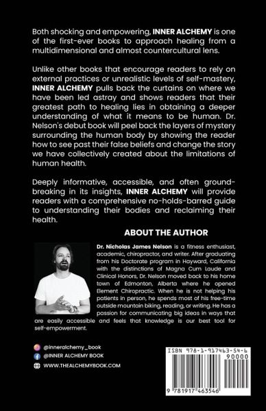 INNER ALCHEMY is an urgent call to action and revolutionary guidebook for readers to understand their bodies and reclaim their health. It starts by exposing the underbelly of our current health and wellness practices by taking the reader on a tour of the power of greed, misinformation, and the sole dependance on the outside-in methods of Western medicine. It compliments these insights by introducing alternative methods of healing and health related theories that could help to revolutionize the way we think of medicine both personally, and globally - discussing topics such as the holographic universe, the power of the kundalini energy system, the effect of words and thought patterns, our body as a battery, chiropractic and natural healing, and much more. It then urges readers to step outside of their preconditioned views of the human body and imagine a level of healing and empowerment that far surpasses their previously assumed limitations of human health. Using my academic training, along with ancient philosophy, esoteric wisdom, and modern scientific thought, INNER ALCHEMY- like Gabor Mate's The Myth of Normal and the groundbreaking work of The Body Keeps the Score - invites readers into an entirely new understanding of themselves and empowers them to take responsibility for their own health once and for all.