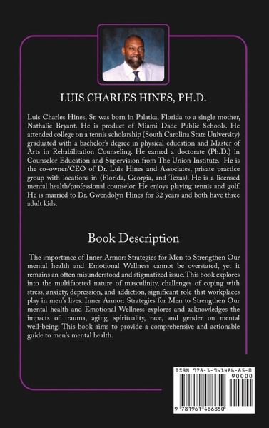 The importance of Inner Armor: Strategies for Men to Strengthen Our mental health and Emotional Wellness cannot be overstated, yet it remains an often misunderstood and stigmatized issue. This book delves into the multifaceted nature of masculinity, highlighting the need for a more inclusive definition that embraces emotional vulnerability. The persistent stigma surrounding men's mental health is identified as a key barrier that prevents men from seeking help, reinforcing the necessity for open dialogue, and understanding. Inner Armor: Strategies for Men to Strengthen Our mental health and Emotional Wellness also delves into the challenges of coping with stress, anxiety, depression, and addiction, offering practical advice and strategies for prevention and recovery. Considering the significant role that workplaces play in men's lives, the importance of creating mentally healthy environments is underscored, while specific aspects of men's lives such as fatherhood and relationships are examined in the context of mental health. Moreover, Inner Armor: Strategies for Men to Strengthen Our mental health and Emotional Wellness explores and acknowledges the impacts of trauma, aging, spirituality, race, and gender on mental well-being, calling for a holistic approach to men's mental health. Resources for professional help are highlighted as crucial for supporting men's mental health, and optimism is expressed for future progress in this important area. Through a blend of research, personal narratives, and practical advice, this exploration aims to provide a comprehensive and actionable guide to men's mental health.