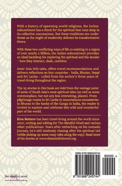 With a history of spawning world religions, the Indian subcontinent has a thirst for the spiritual that runs deep in its collective unconscious. But these traditions are under threat as the might of modernity delivers its transformative blows. With these two conflicting ways of life co-existing in a region of nearly 2 Billion, the Indian subcontinent provides and ideal backdrop for exploring the spiritual and the secular -- how they interact, clash, combine. Inner Asia tell tales, offers travel recommendations and delivers reflections on four countries -- India, Bhutan, Nepal and Sri Lanka -- culled from the author's three years of travel-living throughout the region. The 25 stories in this travel book are told from the vantage point of some of South Asia's most spiritual sites (as well as some commonplace, but not any less interesting, places). From pilgrimage routes in Sri Lanka to mountains monasteries in Bhutan to the banks of the Ganga in India, the reader is invited to explore and celebrate this wild and wonderful part of the world. The stories in this book are a mix of travel magazine articles, personal essays and narratives based on people living in a particular place. Most of the stories are available online on The Mindful Word. Table of Contents: Introduction INDIA SYMPHONY OF CACOPHONY Walking the streets of India LESSONS AT VARANASI Reflecting on life and death in India's most sacred city CLEARLY COMPASSIONATE Seeing the Dalai Lama lights the way to true compassion TAKING REFUGE IN SERVICE An American doctor committed to the principles of seva-selfless service-assists Tibetan refugees in India INTERNET WOES The challenge of getting online in India BANGALORE One foot dangling in the future, one hoof rooted in the past CHECKMATE Play the game with mindfulness and equanimity BORDER WALK The tense Indo-Pak border is opening up to a brand of tourism that's unexpectedly calm THIKSEY MONASTERY Ladakh offers respite from India's busyness SUSTAINABILITY AS SPIRITUAL PRACTICE Volunteer at Sadhana Forest to learn how to live sustainably OM ARUNACHALA Tiruvannamalai-a pilgrimage place for millions KALARIPAYATTU Experience the awesome acrobatics of this ancient martial art SHIKARA HO! Hop aboard for a look at the life of Dal Lake's boat hawkers 3 PEACOCKS & A MONKEY Meeting sattva and rajas at Ramana's ashram SPIRITUAL WARRIORS Mahabodhi grooms tomorrow's spiritual leaders BHUTAN THE LONG ROAD TO HAPPINESS Is Bhutan really the Shangri-La that people think it is? ACCEPTANCE AND EQUANIMITY A lesson learned from a falling mandarin TIGER'S NEST Sublimation and the essence of transformative travel SOBA RIGPA Good health is all in the mind SRI LANKA SRI PADA PILGRIMAGE Christmas on Sri Lanka's most sacred mountain KANDYAN DANCE Sri Lanka's captivating traditional dance form SLOW TRAVEL IN SRI LANKA Slow down your pace to experience the culture of the place NEPAL PILGRIMAGE OF PEACE Lumbini, Nepal-the site of the Buddha's birth TRANSCENDENT BEAUTY From Pokhara to Sarangkot, Nepal VILLAGE THERAPY Learning to live at the pace of "just enough" in