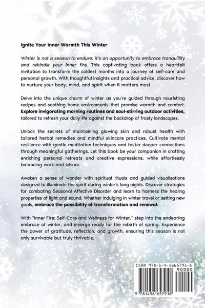 Ignite Your Inner Warmth This Winter Winter is not a season to endure; it's an opportunity to embrace tranquillity and rekindle your inner fire. This captivating book offers a heartfelt invitation to transform the coldest months into a journey of self-care and personal growth. With thoughtful insights and practical advice, discover how to nurture your body, mind, and spirit when it matters most. Delve into the unique charm of winter as you're guided through nourishing recipes and soothing home environments that promise warmth and comfort. Explore invigorating morning routines and soul-stirring outdoor activities , tailored to refresh your daily life against the backdrop of frosty landscapes. Unlock the secrets of maintaining glowing skin and robust health with tailored herbal remedies and mindful skincare practices. Cultivate mental resilience with gentle meditation techniques and foster deeper connections through meaningful gatherings. Let this book be your companion in crafting enriching personal retreats and creative expressions, while effortlessly balancing work and leisure. Awaken a sense of wonder with spiritual rituals and guided visualisations designed to illuminate the spirit during winter's long nights. Discover strategies for combating Seasonal Affective Disorder and learn to harness the healing properties of light and sound. Whether indulging in winter travel or setting new goals, embrace the possibility of transformation and renewal. With "Inner Fire: Self-Care and Wellness for Winter," step into the endearing embrace of winter, and emerge ready for the rebirth of spring. Experience the power of gratitude, reflection, and growth, ensuring this season is not only survivable but truly thrivable.