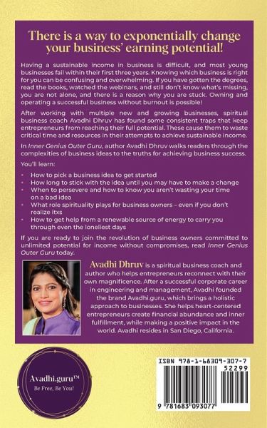 There is a way to exponentially change your business' earning potential!Having a sustainable income in business is difficult, and most young businesses fail within their first three years. Knowing which business is right for you can be confusing and overwhelming. If you have gotten the degrees, read the books, watched the webinars, and still don't know what's missing, you are not alone, and there is a reason why you are stuck. Owning and operating a successful business without burnout is possible!After working with multiple new and growing businesses, spiritual business coach Avadhi Dhruv has found some consistent traps that keep entrepreneurs from reaching their full potential. These cause them to waste critical time and resources in their attempts to achieve sustainable income.In Inner Genius Outer Guru, author Avadhi Dhruv walks readers through the complexities of business ideas to the truths for achieving business success. You'll learn:· How to pick a business idea to get started· How long to stick with the idea until you may have to make a change· When to persevere and how to know you aren't wasting your time on a bad idea· What role spirituality plays for business owners - even if you don't realize it· How to get help from a renewable source of energy to carry you through even the loneliest daysIf you are ready to join the revolution of business owners committed to unlimited potential for income without compromises, read Inner Genius Outer Guru today.