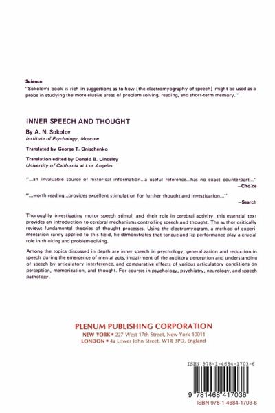 electrical activity during thinking, both with and without verbalization and the use of language. Although seemingly simple, these experiments tackle a very complex subject with which psychologists, linguists, and others are only beginning to come to grips. Sokolov and his group have succeeded admirably in splitting the subject apart by driving in the wedges of objective measurement and unique experimental formulations. Chapter IX dips into the neurology and neurophysiology of motor speech and its feedback mechanisms and the dynamic localization and organization of the cerebral mechanisms responsible for symbolic formulation of speech and thought. The bibliography brings together a considerable number of Russian publications on this subject, as well as some of the pertinent American and European literature. This book is a welcome addition to an important field. Donald B. Lindsley Professor, Departments of Psychology, Physiology, and Psychiatry, and Member of the Brain Research Institute, University of California, Los Angeles Contents Introduction .......................................... . Part One GENERAL PROBLEMS OF STUDY Chapter I Theories of the Interrelation of Speech and Thought ............... 11 Chapter II The Problem of Inner Speech in Psychology ..................... 34 l. Early Investigations of Inner Speech ..................... 34 2. Discussion of Inner-Speech in Soviet Psychology ............ 46 3. Verbal Interference Methods in the Study of Inner Speech ..... 52 4. Detecting Concealed Speech Reactions by Conditioned-Reflex Methods ........................................ 58 5. Conditioned Reflexes to Numbers ...................... 61 6. Clinical Observations . . . . . . . . . . . . . . . . . . . . . . . 61 . . . . . . . .