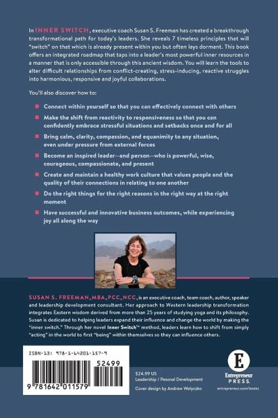 Susan S. Freeman, MBA, PCC, NCC, is an executive coach, team coach, author, speaker and leadership development consultant. Her approach to Western leadership transformation integrates Eastern wisdom derived from more than 25 years of studying yoga and its philosophy. Susan is dedicated to helping leaders expand their influence and change the world by making the “inner switch. Susan received an M.B.A. from Columbia University Graduate School of Business and a B.A. degree from Wellesley College. In addition to Inner Switch: 7 Timeless Principles to Transform Modern Leadership, she is the author of Step Up Now: 21 Powerful Principles for People Who Influence Others. She is an accredited Professional Certified Coach with the International Coaching Federation, the largest coaching body in the world.