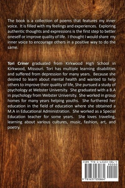 The book is a collection of poems that features my inner voice. It is filled with my feelings and experiences. Exploring authentic thoughts and expressions is the first step to better oneself or improve quality of life. I thought I would share my inner voice to encourage others in a positive way to do the same.