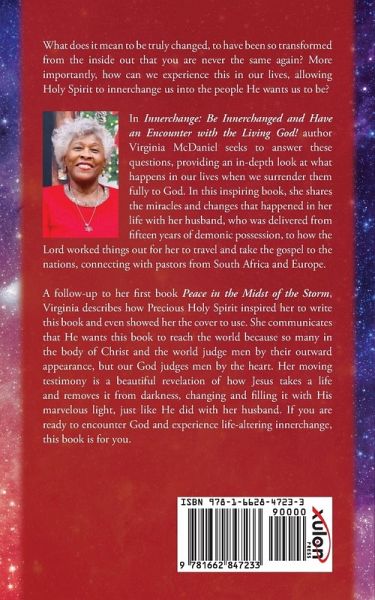 What does it mean to be truly changed, to have been so transformed from the inside out that you are never the same again? More importantly, how can we experience this in our lives, allowing Holy Spirit to innerchange us into the people He wants us to be? In Innerchange: Be Innerchanged and Have an Encounter with the Living God! author Virginia McDaniel seeks to answer these questions, providing an in-depth look at what happens in our lives when we surrender them fully to God. In this inspiring book, she shares the miracles and changes that happened in her life with her husband, who was delivered from fifteen years of demonic possession, to how the Lord worked things out for her to travel and take the gospel to the nations, connecting with pastors from South Africa and Europe. A follow-up to her first book Peace in the Midst of the Storm, Virginia describes how Precious Holy Spirit inspired her to write this book and even showed her the cover to use. She communicates that He wants this book to reach the world because so many in the body of Christ and the world judge men by their outward appearance, but our God judges men by the heart. Her moving testimony is a beautiful revelation of how Jesus takes a life and removes it from darkness, changing and filling it with His marvelous light, just like He did with her husband. If you are ready to encounter God and experience life-altering innerchange, this book is for you.