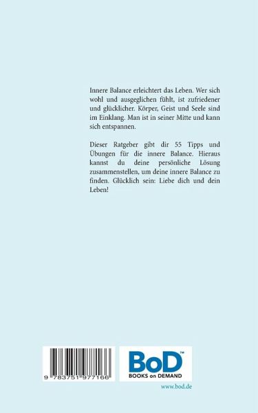 Innere Balance erleichtert das Leben. Wer sich wohl und ausgeglichen fühlt, ist zufriedener und glücklicher. Körper, Geist und Seele sind im Einklang. Man ist in seiner Mitte und kann sich entspannen.Dieser Ratgeber gibt dir eine Fülle von Tipps für die innere Balance. Aus 55 Tipps und praktischen Übungen kannst du deine persönliche Lösung zusammenstellen, um deine innere Balance zu finden. Dieses Buch kann dir dabei helfen, dich und dein Leben lieben zu lernen.Glücklich werden und glücklich sein: Finde deine innere Balance!