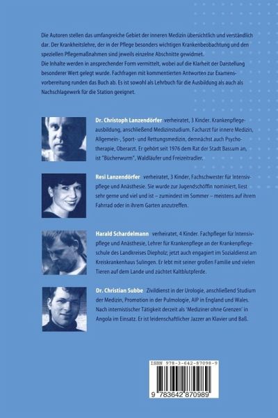 1 Medizin und Pflege - Pflege und Medizin.- 2 Erkrankungen des Herzens und der Gefäße.- 3 Erkrankungen der Lunge und der Atemwege.- 4 Erkrankungen des Magen-Darm-Traktes.- 5 Erkrankungen von Leber, Gallenwegen und Bauchspeicheldrüse.- 6 Erkrankungen der Niere.- 7 Stoffwechselerkrankungen.- 8 Erkrankungen des Blutes und der blutbildenden Organe.- 9 Hormonelle Erkrankungen.- 10 Kollagenosen.- 11 Rheumatische Erkrankungen.- 12 Entzündliche Erkrankungen und Aids.- 13 Erkrankungen der Knochen.- 14 Onkologische Erkrankungen.- 15 Störungen der Hirndurchblutung.- 16 Geriatrie.- 17 Vergiftungen.- 18 Grundlagen der Immunologie und Umweltmedizin.- 19 Psychosomatische Erkrankungen.- Übungsfragen und -antworten.