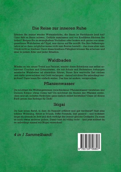 Die Reise zur inneren Ruhe - Das PraxisbuchErleben Sie immer wieder Wutausbrüche, die Ihnen im Nachhinein Leid tun? Oder fällt es Ihnen schwer, Gefühle zuzulassen und vor Konflikten flüchten Sie lieber? Neigen Sie zu zwanghaftem Verhalten oder lenken sich gerne von unangenehmen Wahrheiten ab? Egal, was davon auf Sie zutrifft: Um Ihre Selbstregulation ist es dann möglicherweise nicht zum Besten bestellt - das muss aber zum Glück nicht so bleiben! Denn diese kostbare Fähigkeit können Sie erlernen und zwar in jedem Alter und jeder Situation.Waldbaden - Shinrin Yoku für AnfängerWieder so ein neuer Trend aus Fernost, wieder diese Schwärme aus selbst ernannten Coaches und Erleuchteten, die mit Schals und Heilsteinen behangen asiatische Weisheiten ad absurdum führen, Ihnen Ihre wertvolle Zeit rauben und dafür unverschämt viel Geld verlangen - darauf möchten Sie unbedingt verzichten? Dann lesen Sie einfach weiter. Das hier ist anders, versprochen.Pflanzenwasser - Heilkraft der floralen SeelenDu möchtest die Wirkungsweisen verschiedener Pflanzenwasser verstehen und Deinem Körper etwas Gutes tun? Du möchtest die Seelen der Pflanzen entdecken und am liebsten Hydrolate ganz einfach selbst herstellen? Dann ist dieses Buch genau das Richtige für Dich!IkigaiDu hast einen Beruf, in dem du Respekt erfährst und gut verdienst? Hast eine schöne Wohnung, fährst in Urlaub, triffst Freunde, bist gesund - und trotzdem liegst du abends im Bett und dich verfolgt der immer gleiche Gedanke: Da muss es noch etwas anderes geben. Damit hast du völlig recht - und jetzt solltest du es unbedingt einmal mit Ikigai versuchen!