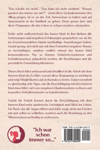 Ob du lachst oder weinst, selbstbewusst oder schüchtern bist - dein Inneres Kind ist die Ursache: Es ist wissenschaftlich erwiesen, dass 99 % deiner heutigen Probleme ihre Wurzel in der Kindheit haben. Dabei ist es nicht relevant, ob sich in deiner Kindheit schwerwiegende Verletzungen ereignet haben. Selbst winzige Erfahrungen, an die du dich nicht mehr erinnerst, können dein ganzes Leben bestimmen. Folgende Probleme sind maßgeblich auf Kindheitserfahrungen zurückzuführen:Du vermeidest Konflikte um jeden Preis - mit dem Ergebnis, deine eigenen Bedürfnisse nicht durchzusetzen Kontrollverhalten, Perfektionismus, Schönheitswahn und der übertriebene Hang zu Diäten Du machst immer wieder ähnliche Erfahrungen mit falschen Partnern oder Begegnungen mit Menschen, die sich als Energievampire entpuppen Du klammerst dich an Menschen und falsche Lebensumstände, weil es besser ist als allein zu sein Häufiges Grübeln und die Suche nach rationalen Erklärungen, damit deine Gefühle nicht an die Oberfläche kommen Wenn die Beschäftigung mit deinem Inneren Kind nicht erfolgt, werden deine Erwachsenenjahre weiter von negativen Verhaltensmustern geprägt sein und wertvolle Lebenszeit wird vergeudet. Auch Autorin Stefanie Lorenz war selbst jahrzehntelang im falschen Leben unterwegs. Erst nach zwei kurz aufeinander folgenden Schicksalsschlägen unternahm sie ihre persönliche Kurskorrektur. Heute hilft sie anderen Menschen, ihr ganz persönliches Glück zu realisieren. Die Begegnung und Arbeit mit dem Inneren Kind ist dabei ein zentraler Baustein. Denn hier liegt der Schlüssel zur Heilung. In ihrem Experten-Ratgeber klärt sie ausführlich darüber auf, wie du in Kontakt mit deinem Inneren Kind treten kannst und so mehr Leichtigkeit und Freude in dein Leben bringst:Verstehe, warum bestimmte Dinge in deinem Leben so sind, wie sie sich gerade darstellen. Entdecke endlich Lösungswege Lies das Kapitel über das Schutzverhalten des Inneren Kindes und du kannst nachvollziehen, warum du in die Opferrolle schlüpfst oder immer auf der Suche nach Anerkennung bist Du möchtest eine belastende Vergangenheit endlich hinter dir lassen? Gehe auf Ursachenforschung und erfahre durch das Modell der Beziehungsstile, warum sich viele Ereignisse und Begegnungen ständig wiederholen Entdecke, wie du das Innere Kind als Spiegel nutzen kannst, um deine Beziehungen mit anderen Menschen oder dein Verhältnis mit deinen eigenen Kindern zu verbessern Möchtest du endlich mehr Lebenslust und Lebensfreude entwickeln? Dann folge einfach den praktischen Tipps im Buch und werde kreativer und spielerischer! Natürlich kannst du so weitermachen wie bisher und dich ständig aufreiben, an dem Gefühl, nicht gut genug zu sein. Doch wäre es nicht viel sinnvoller, herauszufinden, was dein Inneres Kind wirklich braucht, damit du bei dir selbst endlich ankommst? Sichere dir jetzt das Buch, damit du dir endlich geben kannst, was du schon so lange in deinem Leben vermisst! Klicke jetzt auf "Jetzt kaufen", um Freude und Glück in deinen Alltag zurückzubringen