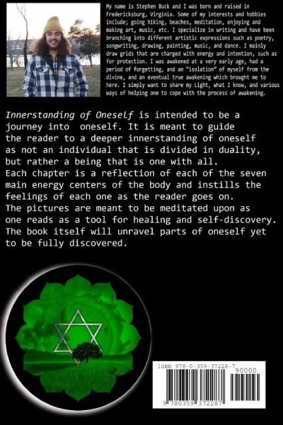 Innerstanding of Oneself is intended to be a journey into oneself. It is meant to guide the reader to a deeper innerstanding of oneself as not an individual that is divided in duality, but rather a being that is one with all. Each chapter is a reflection of each of the seven main energy centers of the body and instills the feelings of each one as the reader goes on. The pictures are meant to be meditated upon as one reads as a tool for healing and self-discovery. The book itself will unravel parts of oneself yet to be fully discovered.