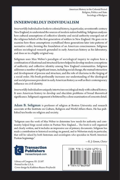 Inner worldly Individualism looks to colonial history, in particular, seventeenth-century New England, to understand the sources of modern nation building. Seligman analyses how cultural assumptions of collective identity and social authority emerged out of the religious beliefs of the first generation of settlers in New England. He goes on to examine how these assumptions crystallized three generations later into patterns of normative order, forming the foundation of an American consciousness. Seligman uses sociological research grounded in early American history as his laboratory, and does so in a highly original way. Seligman uses Max Weber's paradigm of sociological inquiry to explore how a combination of ideational and structural factors helped to develop modern conceptions of authority and collective identity among New England communities. Seligman addresses a number of significant issues, including social change, the mutual interaction and development of process and structure, and the role of charisma in the forging of a social order. His book profoundly increases our understanding of the ideological and social processes prevalent in early American history as well as their contemporary influence on civil identity. Inner worldly Individualism uniquely intertwines sociological study with cultural history. It uses American history to develop and elucidate problems of broad theoretical significance. Seligman's argument is bolstered by a close examination of concrete detail. His book will be of interest to anthropologists, sociologists, political theorists, and historians of American culture.