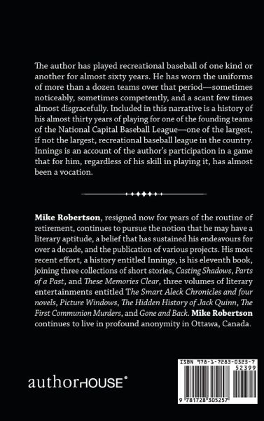 The author has played recreational baseball of one kind or another for almost sixty years. He has worn the uniforms of more than a dozen teams over that period-sometimes noticeably, sometimes competently, and a scant few times almost disgracefully. Included in this narrative is a history of his almost thirty years of playing for one of the founding teams of the National Capital Baseball League-one of the largest, if not the largest, recreational baseball league in the country. Innings is an account of the author's participation in a game that for him, regardless of his skill in playing it, has almost been a vocation.