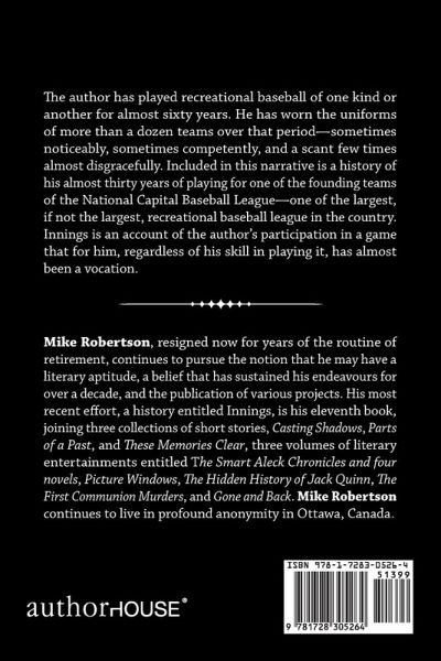 The author has played recreational baseball of one kind or another for almost sixty years. He has worn the uniforms of more than a dozen teams over that period-sometimes noticeably, sometimes competently, and a scant few times almost disgracefully. Included in this narrative is a history of his almost thirty years of playing for one of the founding teams of the National Capital Baseball League-one of the largest, if not the largest, recreational baseball league in the country. Innings is an account of the author's participation in a game that for him, regardless of his skill in playing it, has almost been a vocation.