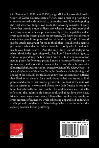On December 3, 1996, at 4:10 pm, Judge Michael Lyon of the District Court of Weber County, State of Utah, sent a man to prison for a crime committed and confessed to by another man. Prior to imposing the final sentence, Judge Lyon made the following remarks: I dont know that there is a more difficult case where a judge does more soul searching in a case where a person staunchly denies culpability and at every turn in the system pleads his innocence. We know that there are cases where people are punished for crimes they didnt do. It would just be utterly repugnant for me to think that I could send a man to prison for a crime that he did not commit I only wish I could look inside your heart. I cant And the only thing I can do today is do what I think is the right thing to do. And I dont know whats right, and so Im just doing the best that I can. His best sent an innocent man to prison for five years, placed him on a state sex offender registry for ten years, and was a life sentence of hatred and abuse because of a fabricated label and conviction. Innocence Beyond the Glass HouseA Story of Injustice and the Final Battle for Freedom is the beginning and ending of the story. Its the truth about how one innocent man suffered then lived to tell the tale. Its a book about rebirth and trying to find peace and discovery that came at great cost. Its a look at the criminal justice system at its worst and shows how Lady Justice is not only blind but habitually deaf and dumb. This work is about survival, self-reflection, the indomitable human soul, and about love then hate, friends then enemies, acceptance followed by complete rejection from every segment of humanity, while exhibiting unparalleled endurance and hope and confidence in divine beings, which gave the author the capacity to abide lifelong suffering.