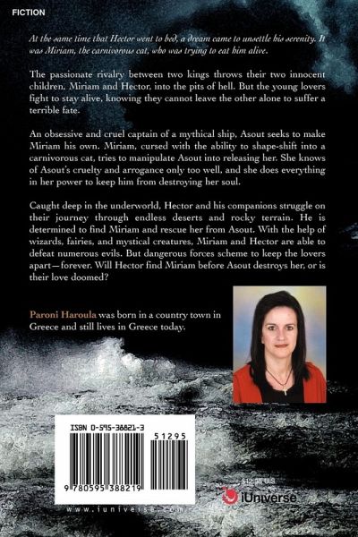 At the same time that Hector went to bed, a dream came to unsettle his serenity. It was Miriam, the carnivorous cat, who was trying to eat him alive. The passionate rivalry between two kings throws their two innocent children, Miriam and Hector, into the pits of hell. But the young lovers fight to stay alive, knowing they cannot leave the other alone to suffer a terrible fate. An obsessive and cruel captain of a mythical ship, Asout seeks to make Miriam his own. Miriam, cursed with the ability to shape-shift into a carnivorous cat, tries to manipulate Asout into releasing her. She knows of Asout's cruelty and arrogance only too well, and she does everything in her power to keep him from destroying her soul. Caught deep in the underworld, Hector and his companions struggle on their journey through endless deserts and rocky terrain. He is determined to find Miriam and rescue her from Asout. With the help of wizards, fairies, and mystical creatures, Miriam and Hector are able to defeat numerous evils. But dangerous forces scheme to keep the lovers apart-forever. Will Hector find Miriam before Asout destroys her, or is their love doomed?