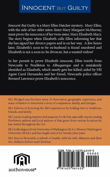 Innocent But Guilty is a Mary Ellen Hatcher mystery. Mary Ellen, with the aide of her older sister, Sister Mary Margaret McMurray, must prove the innocence of her twin sister, Mary Elizabeth Macy. The story begins when Elizabeth calls Ellen informing her she has signed her divorce papers and is on her way. A few hours later, Elizabeth's soon-to-be ex-husband is found murdered and Elizabeth is not a soon-to-be divorcee but a wanted widow! In her pursuit to prove Elizabeth innocent, Ellen travels from Newcastle to Pendleton to Albuquerque and is mistakenly identified as Elizabeth, which nearly gets her killed; aided by FBI Agent Carol Hernandez and her friend, Newcastle police officer Bernard Lawrence prove Elizabeth's innocence.