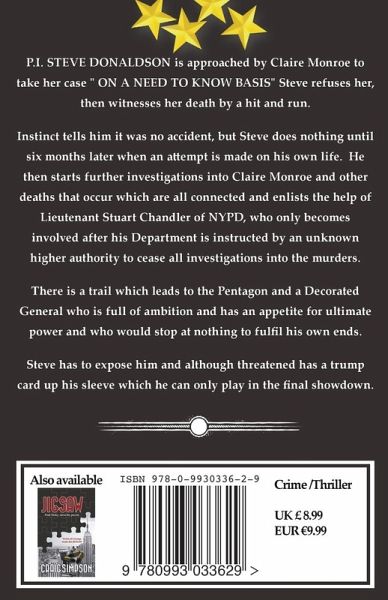 P.I. Steve Donaldson is approached by Claire Monroe to take her case " ON A NEED TO KNOW BASIS" Steve refuses her, then witnesses her death by a hit and run. Instinct tells him it was no accident, but Steve does nothing until six months later when an attempt is made on his own life. He then starts further investigations into Claire Monroe and other deaths that occur which are all connected and enlists the help of Lieutenant Stuart Chandler of NYPD, who only becomes involved after his Department is instructed by an unknown higher authority to cease all investigations into the murders. There is a trail which leads to the Pentagon and a Decorated General who is full of ambition and has an appetite for ultimate power and who would stop at nothing to fulfil his own ends. Steve has to expose him and although threatened has a trump card up his sleeve which he can only play in the final showdown.