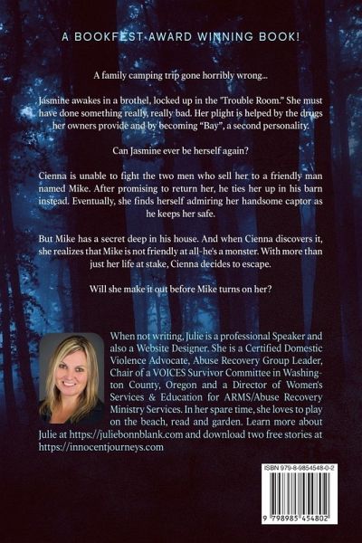 INNOCENT LIVES IS A BOOKFEST AWARD WINNER, HOPE PYX INTERNATIONAL AWARD-WINNER AND AN AMERICAN BOOKFEST FINALIST. A family camping trip gone horribly wrong... Jasmine awakes in a brothel, locked up in the "Trouble Room." She must have done something really, really bad. Her plight is helped by the drugs her owners provide and by becoming "Bay", a second personality. Can Jasmine ever become herself again? Cienna is unable to fight the two men who sell her to a friendly man named Mike. After promising to return her, he ties her up in his barn instead. Eventually, she finds herself admiring her handsome captor as he keeps her safe. But Mike has a secret deep in his house. And when Cienna discovers it, she realizes that Mike is not friendly at all-he's a monster. With more than just her life at stake, Cienna decides to escape. Will she make it out before Mike turns on her? This suspenseful, domestic thriller satisfies a hankering for a good mystery with a human trafficking as a subject. It is full of twists and turns which include a woman sleuth's efforts and guardian angels to save the girls. WHAT PEOPLE ARE SAYING ABOUT INNOCENT LIVES: INNOCENT LIVES INCLUDES A HEAVY TOPIC... BUT BEAUTIFULLY WRITTEN. "This book was one that I couldn't put down. Once I started it I knew that it would be one of those that made me want to stay up and finish it. It did not disappoint..." CMH The author did an amazing job at telling the character's story...only a few chapters in I am rooting for these two girls like never before. I rivaled at the characters strengths. It was a beautiful story of strength and endurance. I will remember it for a very long time." -Claire INNOCENT LIVES IS A WELL-WRITTEN BOOK! "I knew after reading Innocent Journeys: Rose and Penny this book would be good. I never imagined how good though! ...I read Go Ask Alice at a way younger age than I probably should have, but it stayed with me and shaped my life as well as many others lives. I think this book will too. -dagaz98