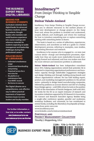 Innoliteracy: From Design Thinking to Tangible Change encourages you to allocate resources in the earliest phases of your next development or change project-to the fuzzy front end, where the problem is unveiled and understood, scoped, defined, and challenged, and where the roadmap for how to introduce something new or replace something existing with something better is drawn. The book is based on a series of reflections, experiences, observations, and anecdotes as well as a guide to a better development process, referring to examples, case studies, and existing literature and research. Innoliteracy is for anyone who is engaged in-or even just curious about-change and development processes, especially how they are made more stakeholder-focused, thoroughly framed and reframed, and how one makes sure that the most relevant and imminent problem is addressed.