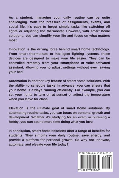 What is Smart Home Automation?In today's world, where the power of technology is constantly evolving, the concept of smart home automation has gained tremendous popularity. This subchapter aims to introduce students to the fascinating world of smart home solutions and how they can revolutionize our daily lives.So, what exactly is smart home automation? Simply put, it is the integration of various electronic devices and systems within a house to create an interconnected network that can be controlled remotely. Imagine being able to control your lights, thermostat, security cameras, and even your kitchen appliances with just a few taps on your smartphone or through voice commands. That's the power of smart home automation!One of the key advantages of smart home automation is convenience. Students, like any other busy individuals, often find themselves juggling multiple tasks and responsibilities. With smart home technology, you can automate repetitive tasks and create personalized schedules for your devices. For instance, you can program your lights to turn on gradually in the morning, simulating a natural sunrise and helping you wake up refreshed.Moreover, smart home automation offers enhanced energy efficiency. By monitoring your energy consumption and optimizing the usage of your devices, you can significantly reduce your carbon footprint and save money on utility bills. For students who are conscious about the environment and want to make a positive impact, adopting smart home solutions is a step in the right direction.Furthermore, smart home automation provides an added layer of security. With integrated security systems, you can remotely monitor your home, receive real-time alerts, and even control your door locks. This ensures that your living space is safe and secure, giving you peace of mind, especially when you are away from home for extended periods.