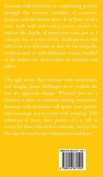 Innovate with Intention is a captivating journey through the intricate interplay of creativity, purpose, and the human spirit. Jessy Jänes, with a voice both bold and tender, invites readers to explore the depths of innovation-not just as a concept, but as a way of life. Each poem in this collection is a reflection on how we can shape the world around us with deliberate action, mindful of the impact our choices have on ourselves and others. Through verses that resonate with authenticity and insight, Jänes challenges us to rethink the way we approach change. Whether you are a dreamer, a doer, or someone seeking inspiration, Innovate with Intention will ignite your passion and encourage you to create with meaning. This collection is more than poetry-it's a call to action for those who wish to innovate, not just for the sake of novelty, but with purpose and heart. Copyright © 2024 Book Fairy Publishing