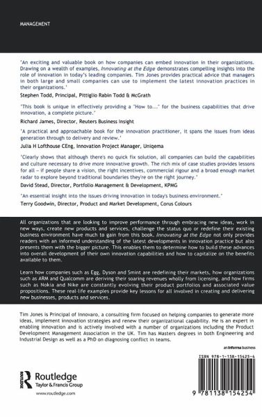 'An exciting and valuable book on how companies can embed innovation in their organizations. Drawing on a wealth of examples, Innovating at the Edge demonstrates compelling insights into the role of innovation in today's leading companies. Tim Jones provides practical advice that managers in both large and small companies can use to implement the latest innovation practices in their organizations'.