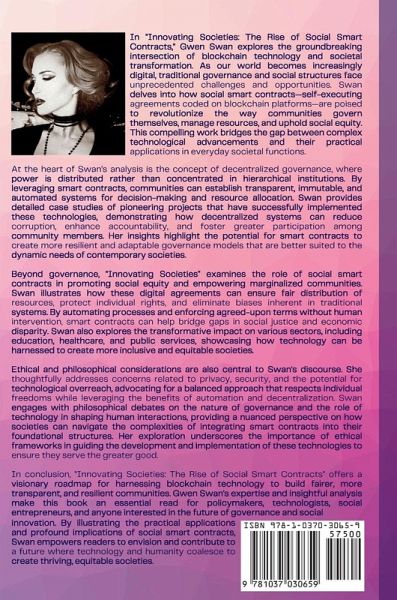 In "Innovating Societies: The Rise of Social Smart Contracts," Gwen Swan explores thegroundbreaking intersection of blockchain technology and societal transformation. As our worldbecomes increasingly digital, traditional governance and social structures face unprecedentedchallenges and opportunities. Swan delves into how social smart contracts-self-executingagreements coded on blockchain platforms-are poised to revolutionize the way communitiesgovern themselves, manage resources, and uphold social equity. This compelling work bridgesthe gap between complex technological advancements and their practical applications ineveryday societal functions. At the heart of Swan's analysis is the concept of decentralized governance, where power isdistributed rather than concentrated in hierarchical institutions. By leveraging smart contracts,communities can establish transparent, immutable, and automated systems for decision-makingand resource allocation. Swan provides detailed case studies of pioneering projects that havesuccessfully implemented these technologies, demonstrating how decentralized systems canreduce corruption, enhance accountability, and foster greater participation among communitymembers. Her insights highlight the potential for smart contracts to create more resilient andadaptable governance models that are better suited to the dynamic needs of modern societies.Beyond governance, "Innovating Societies" examines the role of social smart contracts inpromoting social equity and empowering marginalized communities. Swan illustrates how thesedigital agreements can ensure fair distribution of resources, protect individual rights, andeliminate biases inherent in traditional systems. By automating processes and enforcingagreed-upon terms without human intervention, smart contracts can help bridge gaps in socialjustice and economic disparity. Swan also explores the transformative impact on varioussectors, including education, healthcare, and public services, showcasing how technology canbe harnessed to create more inclusive and equitable societies. Ethical and philosophical considerations are also central to Swan's discourse. She thoughtfullyaddresses concerns related to privacy, security, and the potential for technological overreach,advocating for a balanced approach that respects individual freedoms while leveraging thebenefits of automation and decentralization. Swan engages with philosophical debates on thenature of governance and the role of technology in shaping human interactions, providing anuanced perspective on how societies can navigate the complexities of integrating smartcontracts into their foundational structures. Her exploration underscores the importance ofethical frameworks in guiding the development and implementation of these technologies toensure they serve the greater good.In conclusion, "Innovating Societies: The Rise of Social Smart Contracts" offers a visionaryroadmap for harnessing blockchain technology to build fairer, more transparent, and resilientcommunities. Gwen Swan's expertise and insightful analysis make this book an essential readfor policymakers, technologists, social entrepreneurs, and anyone interested in the future ofgovernance and social innovation. By illustrating the practical applications and profoundimplications of social smart contracts, Swan empowers readers to envision and contribute to afuture where technology and humanity coalesce to create thriving, equitable societies.