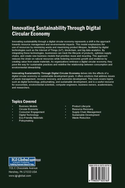 Innovating sustainability through a digital circular economy represents a shift in the approach towards resource management and environmental impacts. This model emphasizes the use of resources by minimizing waste and maximizing product lifespan, facilitated by digital technologies such as the Internet of Things (IoT), blockchain, and big data analytics. By integrating these technologies, businesses can track the lifecycle of products, optimize supply chains, and create new business models that prioritize reuse and recycling. This approach reduces the strain on natural resources while fostering economic growth and resilience by creating value from waste materials. As organizations embrace a digital circular economy, they pave the way for sustainable practices and redefine the relationship between consumption and environmental stewardship. Innovating Sustainability Through Digital Circular Economy delves into the effects of a digital circular economy on sustainable development goals. It offers solutions that address issues of waste management, resource recovery, and economic development. This book covers topics such as digital technology, policymaking, and sustainable development, and is a useful resource for economists, environmental scientists, computer engineers, business owners, academicians, and researchers.