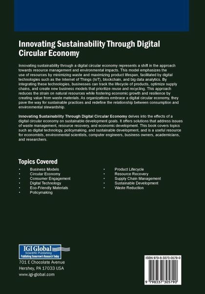 Innovating sustainability through a digital circular economy represents a shift in the approach towards resource management and environmental impacts. This model emphasizes the use of resources by minimizing waste and maximizing product lifespan, facilitated by digital technologies such as the Internet of Things (IoT), blockchain, and big data analytics. By integrating these technologies, businesses can track the lifecycle of products, optimize supply chains, and create new business models that prioritize reuse and recycling. This approach reduces the strain on natural resources while fostering economic growth and resilience by creating value from waste materials. As organizations embrace a digital circular economy, they pave the way for sustainable practices and redefine the relationship between consumption and environmental stewardship. Innovating Sustainability Through Digital Circular Economy delves into the effects of a digital circular economy on sustainable development goals. It offers solutions that address issues of waste management, resource recovery, and economic development. This book covers topics such as digital technology, policymaking, and sustainable development, and is a useful resource for economists, environmental scientists, computer engineers, business owners, academicians, and researchers.