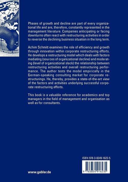 Organizational decline and corporate turnarounds are historically at the height of interest, both theoretically as well as with regard to current practice. Characterized as the opposite of successful adaptation, organizational decline is the failure to anticipate, avoid, neutralize, and adapt to external or internal pressures, thus triggering a process of decreasing organizational resources over a specific period of time that might, but not necessarily needs to, end in corporate failure. Turnaround management is intuitively related to efficiency seeking, co- cutting, streamlining processes, simplifying structures, etc. , etc. The questioning of a simple, one-sided view of cost management and short-term survival is already a challenging task. To associate exploitation and exploration with a successful long-term-oriented turnaround and to empirically search for it in the turnaround world is a truly exceptional endeavor, an interesting topic as such, and a creative and exciting perspective. Achim Schmitt does not only have personal experience with restructuring, but he has for many years done very interesting research into the field of corporate restructuring and behavior in respect of organizational decline. His dissertation project analyzed organizations' reactions to situations of organizational decline. The results of his work revealed how organizations manage to avoid bankruptcy, while simultaneously achieving sustainable growth for corporate survival. Besides providing insights into how restructurings are carried out in practice, the strength of this book lies in the integration of multiple research streams and the results of a larger empirical study.