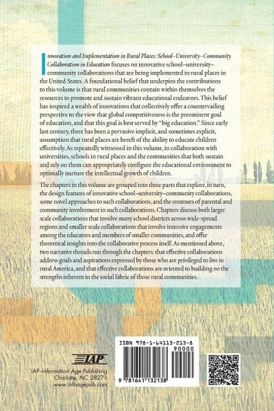 This volume focuses on innovative school-university-community collaborations that are being implemented in rural places in the United States. A foundational belief that underpins the contributions to this volume is that rural communities contain within themselves the resources to promote and sustain vibrant educational endeavors. This belief has inspired a wealth of innovations that collectively offer a countervailing perspective to the view that global competitiveness is the preeminent goal of education, and that this goal is best served by "big education." Since early last century, there has been a pervasive implicit, and sometimes explicit, assumption that rural places are bereft of the ability to educate children effectively. As repeatedly witnessed in this volume, in collaboration with universities, schools in rural places and the communities that both sustain and rely on them can appropriately configure the educational environment to optimally nurture the intellectual growth of children. The chapters in this volume are grouped into three parts that explore, in turn, the design features of innovative school-university-community collaborations, some novel approaches to such collaborations, and the contours of parental and community involvement in such collaborations. Chapters discuss both larger scale collaborations that involve many school districts across wide-spread regions, and smaller scale collaborations that involve intensive engagements among the educators and members of smaller communities, and offer theoretical insights into the collaborative process itself. As mentioned above, two narrative threads run through the chapters: that effective collaborations address goals and aspirations expressed by those who are privileged to live in rural America, and that effective collaborations are oriented to building on the strengths inherent in the social fabric of those rural communities.