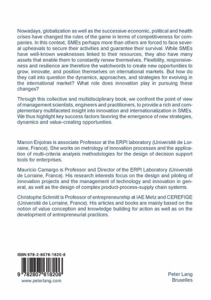 Through this collective and multidisciplinary book, we confront the point of view of management scientists, engineers and practitioners, to provide a rich and complementary multifaceted insight into innovation and internationalization in SMEs. We thus highlight key success factors favoring the emergence of new strategies, dynamics and value-creating opportunities.