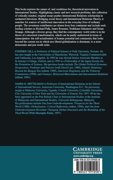 Part I. Rethinking Remaking the Roots of Global Social and Political Theory: 1. Transformation and innovation in the study of world order Stephen Gill; 2. Consciousness, myth and collective action: Gramsci, Sorel and the ethical state Enrico Augelli and Craig N. Murphy; 3. Critical realism and the demystification of interstate power E. H. Carr, Hedley Bull and Robert W. Cox Richard Falk; 4. Ibn Khaldun and world order Mustapha Pasha; Part II. Political Economy: the Social and Ecological Anatomy of Transformation: 5. Ecology, political economy and the counter-movement: Karl Polanyi and the second great transformation Mitchell Bernard; 6. Braudelian reflections on economic globalisation: the historian as pioneer, Eric Helleiner; 7. Social forces and international political economy: joining the two IRs Jeffrey Harrod; 8. Transnational class formation and state forms Kees van der Pijl; Part III. Transformation, Innovation and Emancipation in Global Political and Civil Society: 9. Globalisation and contested common sense in the United States Mark Rupert; 10. The silent revolution and the weapons of the weak: transformation and innovation from below Fantu Cheru; 11. Frantz Fanon, decolonisation and the emerging world order Randolph Persaud; 12. Whose crisis? Early and post-modern masculinism V. Spike Peterson; Part IV. Reflections on Global Order in the Twenty-First Century: 13. Civil society and democratic world order Yoshikazu Sakamoto; 14. Imposing global order: a synthesised ontology for a turbulent era James N. Rosenau; 15. The problem or the solution? Capitalism and the state system Susan Strange; 16. Rethinking innovation in international studies: global transformation at the turn of the millennium James H. Mittelman.