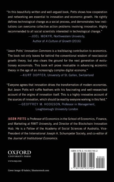 Innovation is among the most important topics in understanding economic sustained economic growth. Jason Potts argues that the initial stages of innovation require cooperation under uncertainty and draws from insights on the solving of commons problems to shed light on policies and conditions conducive to the creation of new firms and industries. The problems of innovation commons are overcome, Potts shows, when there are governance institutions that incentivize cooperation, thereby facilitating the pooling of distributed information, knowledge, and other inputs. The entrepreneurial discovery of an economic opportunity is thus an emergent institution resulting from the formation of a cooperative group, under conditions of extreme uncertainty, working toward the mutual purpose of opportunity discovery about a nascent technology or new idea. Among the problems commons address are those of the identity; cooperation; consent; monitoring; punishment; and independence. A commons is efficient compared to the creation of alternative economic institutions that involve extensive contracting and networks, private property rights and price signals, or public goods (i.e. firms, markets, and governments). In other words, the origin of innovation is not entrepreneurial action per se, but the creation of a common pool resource from which entrepreneurs can discover opportunities. Potts' framework draws on the evolutionary theory of cooperation and institutional theory of the commons. It also has important implications for understanding the origin of firms and industries, and for the design of innovation policy. Beginning with a discussion of problems of knowledge and coordination as well as their implications for common pool environments, the book then explores instances of innovation commons and the lifecycle of innovation, including increased institutionalization and rigidness. Potts also discusses the possible implications of the commons framework for policies to sustain innovation dynamics.