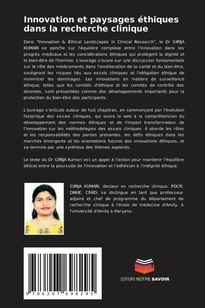 Dans "Innovation & Ethical Landscapes in Clinical Research", le Dr GIRIJA KUMARI se penche sur l'équilibre complexe entre l'innovation dans les progrès médicaux et les considérations éthiques qui protègent la dignité et le bien-être de l'homme. L'ouvrage s'ouvre sur une discussion fondamentale sur le rôle des médicaments dans l'amélioration de la santé et du bien-être, soulignant les risques liés aux essais cliniques et l'obligation éthique de minimiser les dommages. Les innovations en matière de surveillance éthique, telles que les comités d'éthique et les comités de contrôle des données, sont présentées comme des développements importants pour la protection du bien-être des participants.L'ouvrage s'articule autour de huit chapitres, en commençant par l'évolution historique des essais cliniques, qui ouvre la voie à la compréhension du développement des normes éthiques et de l'impact transformateur de l'innovation sur les méthodologies des essais cliniques. Il aborde les rôles et les responsabilités des parties prenantes, les défis éthiques dans les marchés émergents et les orientations futures des innovations éthiques, et se termine par une synthèse des thèmes explorés.Le texte du Dr GIRIJA Kumari est un appel à l'action pour maintenir l'équilibre délicat entre la poursuite de l'innovation et l'adhésion à l'intégrité éthique.