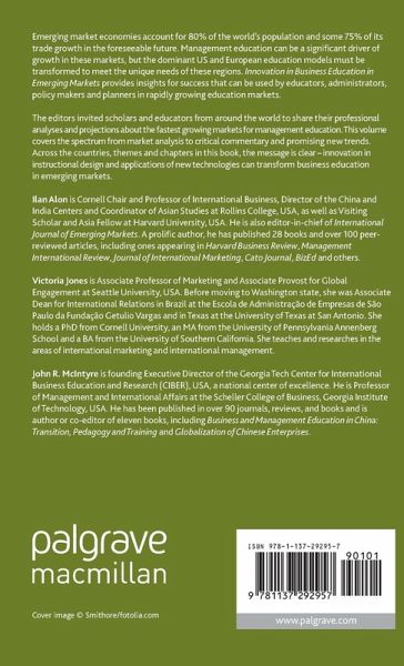 Foreword; Charles Wankel Introduction; John R. McIntyre PART I: REGIONAL TRAJECTORIES 1. Management Education in Africa: Prospects and Challenges; John Kuada 2. Advancing People Skills for 21st Century Business Education in Chile; María-Teresa Lepeley and Carlos A. Albornoz 3. Emerging Trends in Higher Education in the GCC: A Critical Assessment; Mourad Dakhli and Dina El Zohairy 4. An Overview of Indian Education System: From Its Religious Roots to Its Present Incarnation; Jitender Gill 5. The Development of Business Education in a Young, Entrepreneurial Country: The Case of Israel; Diana Bank and Tamar Almor 6. Business Education in the Emerging Economy of Vietnam:Twenty Years of Expectations, Illusions, and Lessons; Quan Hoang Vuong, Tri Dung Tran, Nancy K. Napier and Thuy Ha Dau PART II: CONTENT ADAPTATIONS 7. Economic and Management Education in China: The Pros and Cons of Emulating the US Model; Penelope B. Prime 8. International Accreditation of Business Schools in Emerging Markets: A Study of FGV-EAESP and Insper in Brazil; Eric Ford Travis 9. Business Education and Ethics: The Case of Mexico as an Emerging Market; Francisco Iracheta and Diana Bank 10. Stakeholder Dialogues in Transition Economies: Educating and Training Leaders to Build Relations between Investors and Local Communities; Roland Bardy and Maurizio Massaro PART III: NEW DIRECTIONS 11. A Review of the Current Status of Mobile Apps in Education: Implications for Emerging Countries' Business Education Strategies Education; Christoph Lattemann and Ferial Khaddage 12. India Today: From Brain Drain to Brain Gain; P.J.Lavakare 13. Reaping the Benefits of Brain Circulation: The Impact of the Overseas Study and the Returnees on the Development of the Management Education in China; Wenxian Zhang 14. Outsourcing Global Skills Development to Australian Vocational Colleges: A Case Study on Reverse Transnationalization; Valeri Chukhlomin and Irina Chukhlomina 15. New Ways to Think About Business Educationfor Emerging Markets; Victoria Jones