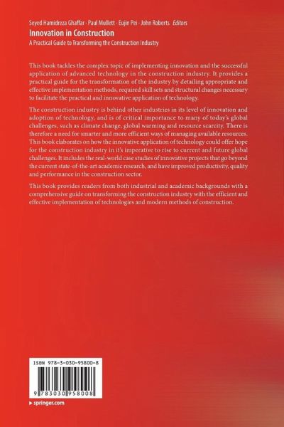 The construction industry is behind other industries in its level of innovation and adoption of technology, and is of critical importance to many of today's global challenges, such as climate change, global warming and resource scarcity. There is therefore a need for smarter and more efficient ways of managing available resources. This book elaborates on how the innovative application of technology could offer hope for the construction industry in it's imperative to rise to current and future global challenges. It includes the real-world case studies of innovative projectsthat go beyond the current state-of-the-art academic research, and have improved productivity, quality and performance in the construction sector.