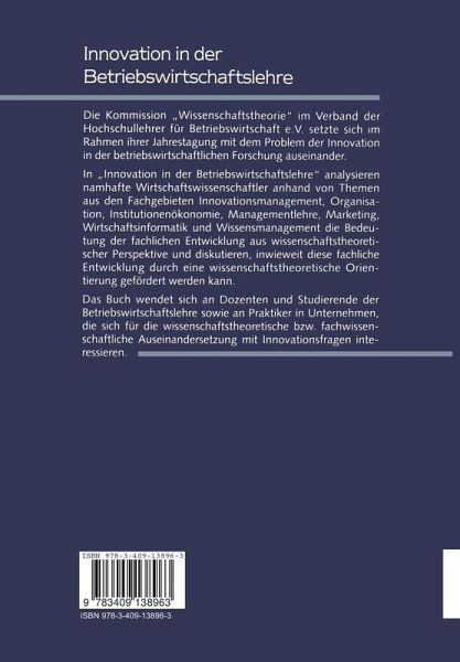 Kooperation von Unternehmen zur Durchsetzung von Innovationen.- Innovation in die Betriebswirtschaftslehre.- Erfinden in dialektischer Tradition.- Neue Institutionenökonomik, axiomatische Methode und "Economics-of-rhetoric-approach": Zum Verhältnis von Betriebswirtschafts- und Wissenschaftstheorie.- Wissenschaftstheoretische Herausforderungen der Wirtschaftsinformatik.- Befreiung von Denkblockaden durch Betrachtung von Marketingproblemen aus konstruktivistischer Sicht.- Innovation durch Aktion?.- Rationalität in innovativen Entscheidungsprozessen.- Organisatorisches Lernen und neues Wissen: Einige Kommentare und einige Fragen zum Wissensmanagement aus wissenschaftstheoretischer Sicht.